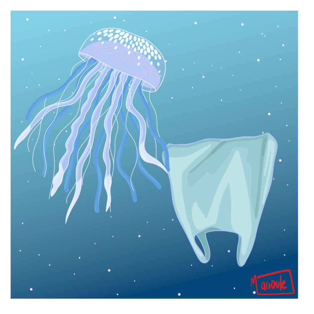 Les animaux qui mangent des méduses, comme les tortues ou les poissons lune, ne font pas la différence entre une méduse et un sac plastique. Ils s’étouffent en les ingérant.